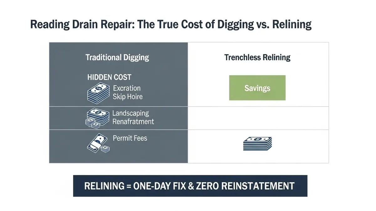 If you wait until the pipe collapses, the cost jumps from a standard £600–£1,200 relining job to a full-scale excavation that can easily exceed £3,000-£5,000, especially if we have to navigate utility lines or reinstate expensive landscaping near Ealing.